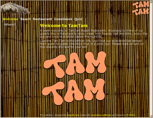 Categories | Beach, Café and Bar, Restaurant | Location | Mastihari (between Neptune and Horizon) | Language | English | Main objectives | Drinks and bites, Wining and dining, Beach pleasure | Homepage | | Appearance | Design, setup and maintenance by kosweb.com | E-mail | info@tamtam.gr | Link | www.tamtam.gr |